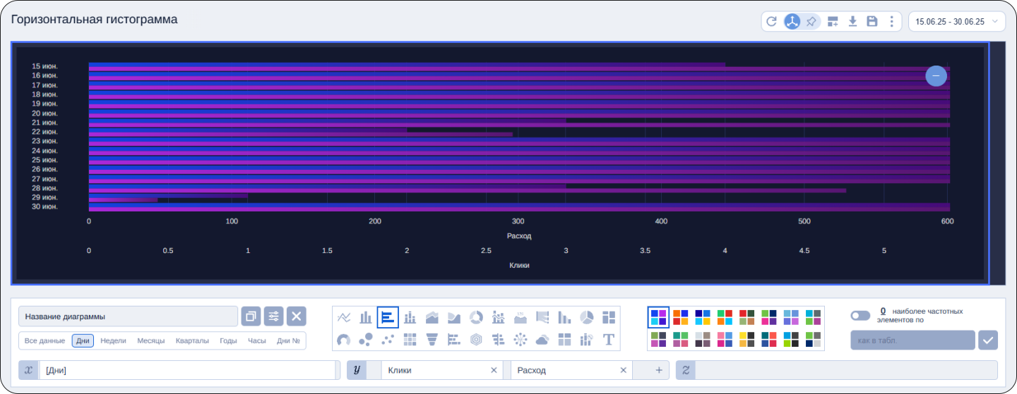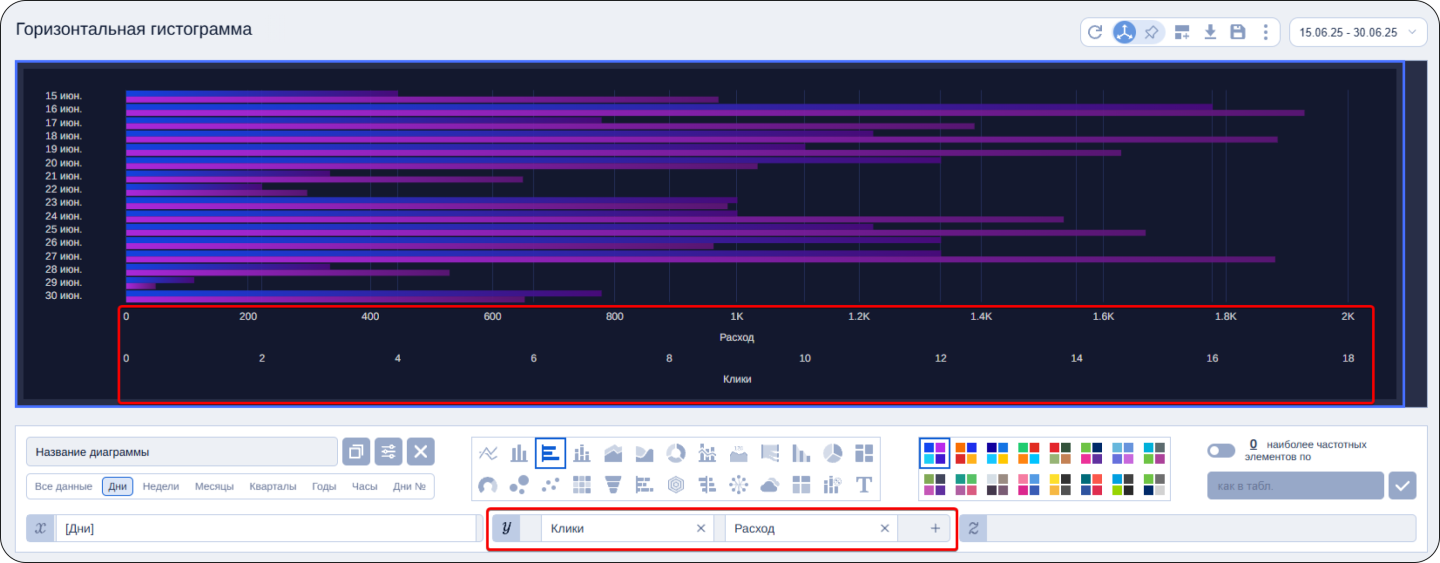 Для вывода показателя на оси координат, требуется добавить показатели из таблицы статистических данных на них. Подробные инструкции представлены в описании области настройки диаграммы.