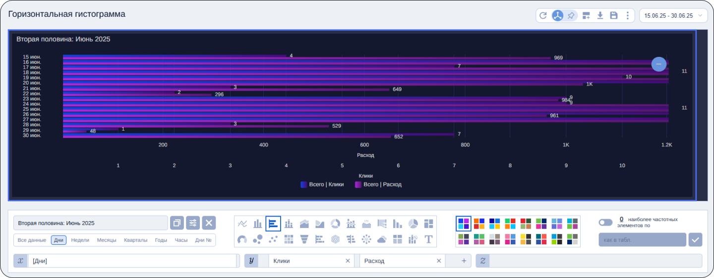 Ось «Y» используется для выбора показателя или нескольких показателей, на основе которых на гистограмме будут сопоставляться сегменты, обусловленные уровнем линейной вложенности, актуальным на данный момент.