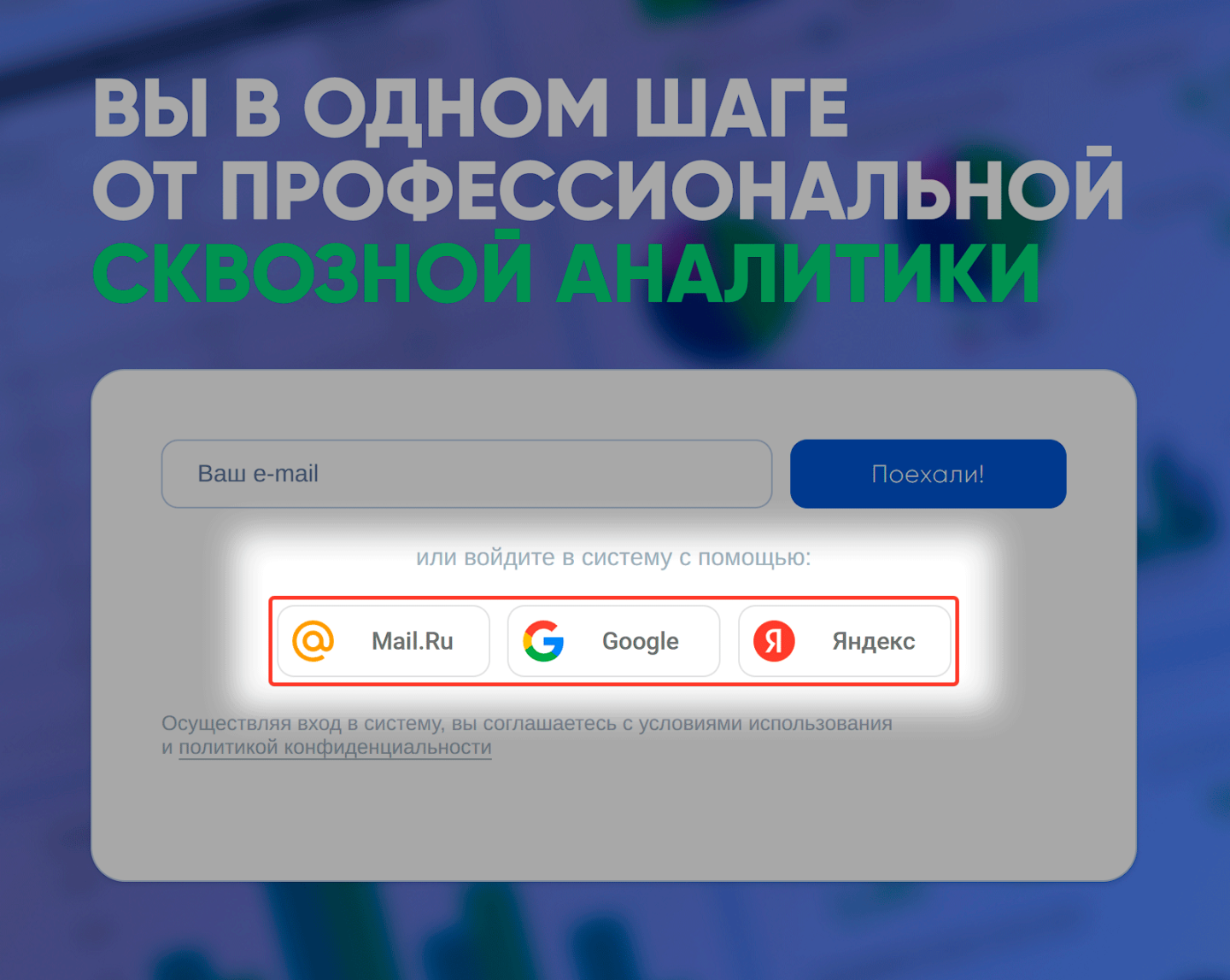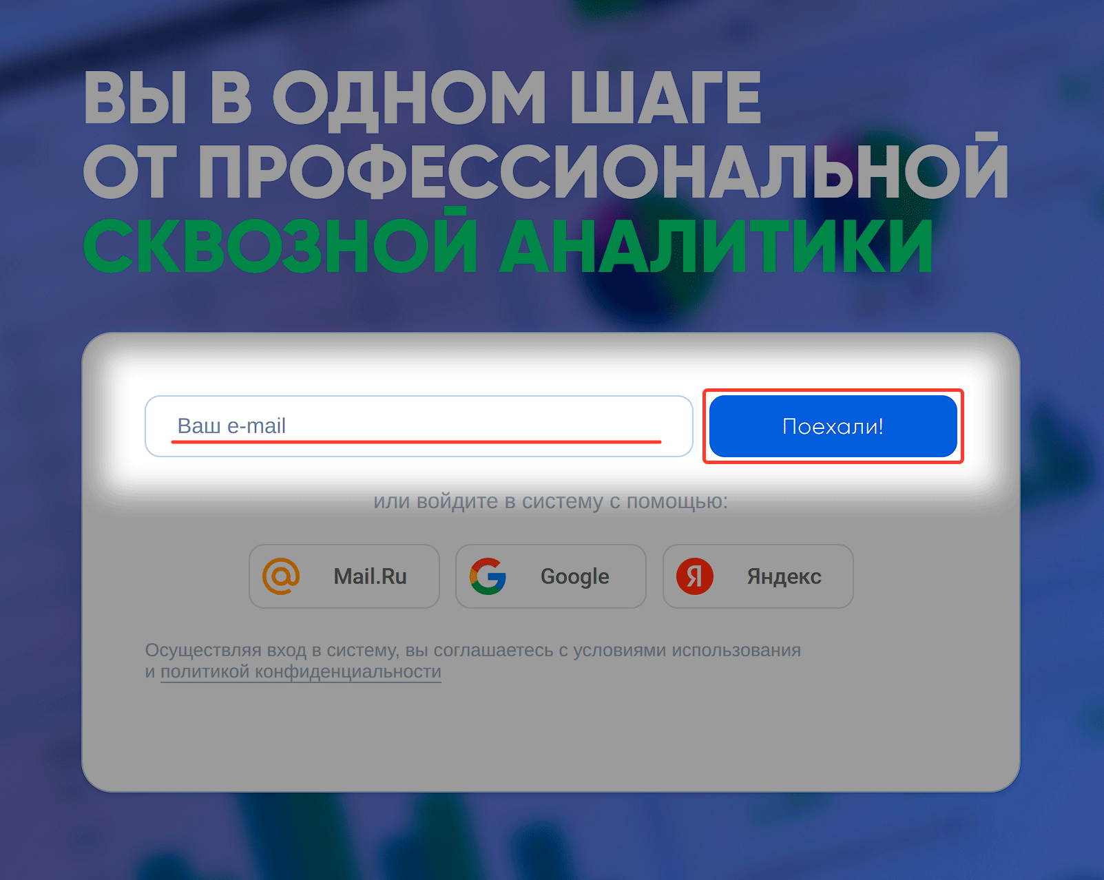 На открывшейся странице введите свой e-mail и нажмите кнопку «Поехали!» (для авторизации через e-mail):