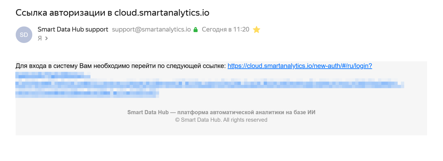 На указанный вами при регистрации e-mail придет ссылка авторизации в сервисе https://cloud.smartanalytics.io – пройдите по ней и завершите регистрацию по данной инструкции на следующем шаге.