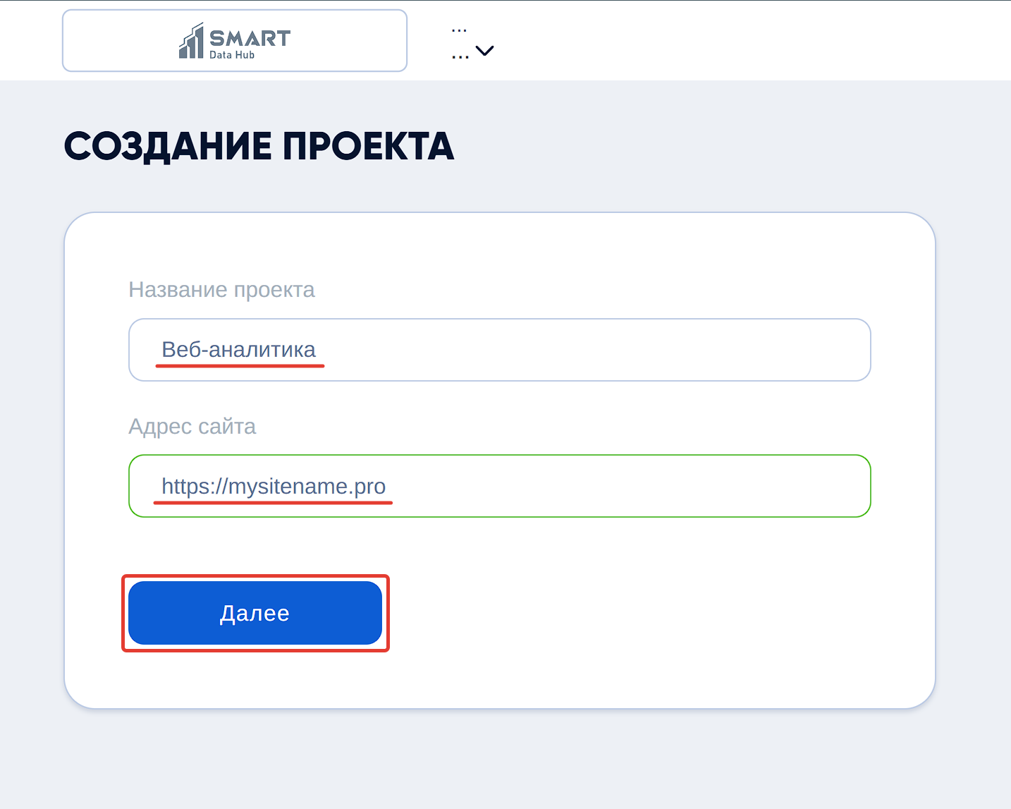 5. Для создания проекта в Smart Data Hub достаточно заполнить поля с Названием проекта и Адресом сайта. URL сайта стоит вводить с указанием протокола «https://«.