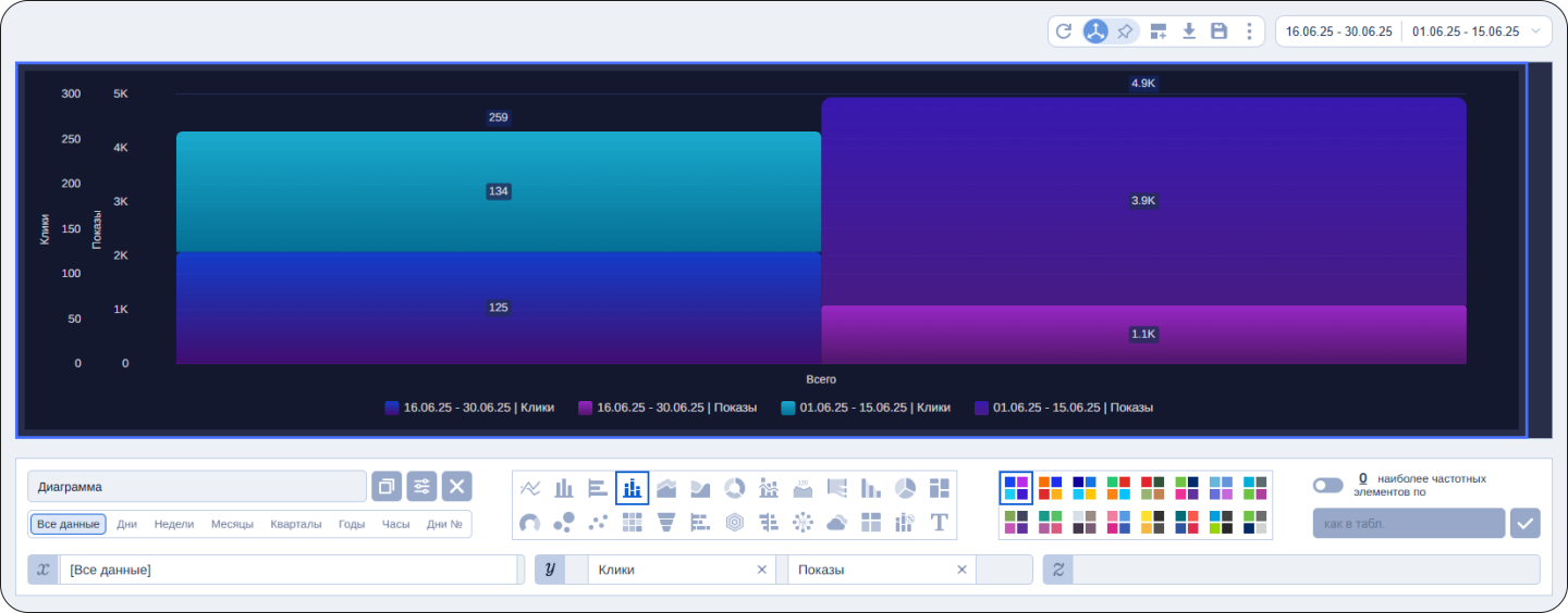 Ось «Y» используется для выбора показателя или нескольких показателей, на основе которых на гистограмме будут сопоставляться сегменты, обусловленные уровнями линейной вложенности и каскадной вложенности, актуальными на данный момент, а также выбранными временными диапазонами.