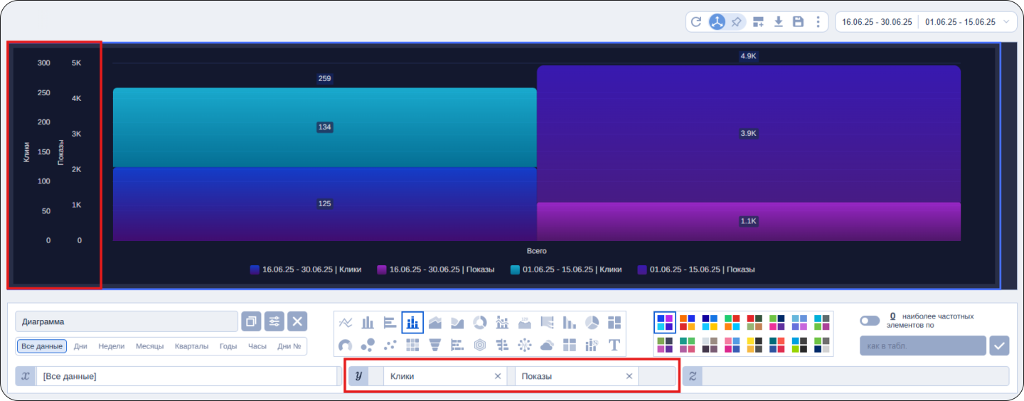 Для вывода показателя на оси координат, требуется добавить показатели из таблицы статистических данных на них. Подробные инструкции представлены в описании области настройки диаграммы.