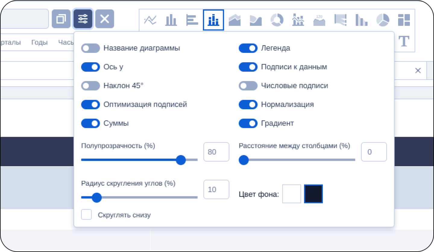 Отметьте галочками внутри каждого линейного сегмента данных, которые будут стэками столбцов, галочки напротив тех временных диапазонов, которые необходимо сделать столбцами.
